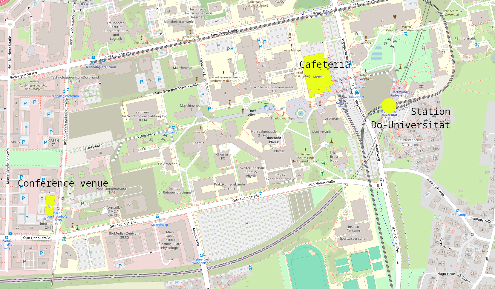 - S1 from Dortmund main station or Düsseldorf - take the stop 'Dortmund Universität', from there you can walk to the venue (15 min) or take either bus line 462 in direction 'Huckarde Bushof U' to 'Joseph-von-Fraunhofer-Straße' or line 445 in direction 'Otto-Hahn-Straße' to 'Martin-Schmeißer-Weg'. Line 462 stops directly in front of the conference venue.